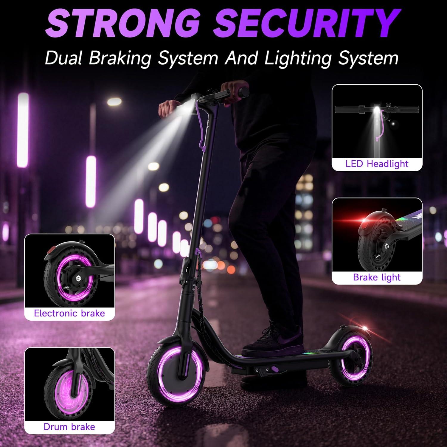 Safer Riding Design: From a safety perspective, our electric scooter for commute are equipped with bright LED headlights and rear warning lights to ensure clear visibility even at night. The front electronic brake and rear drum brake provide reliable braking force, providing a safer and more stable braking. Let you not worry about night riding.