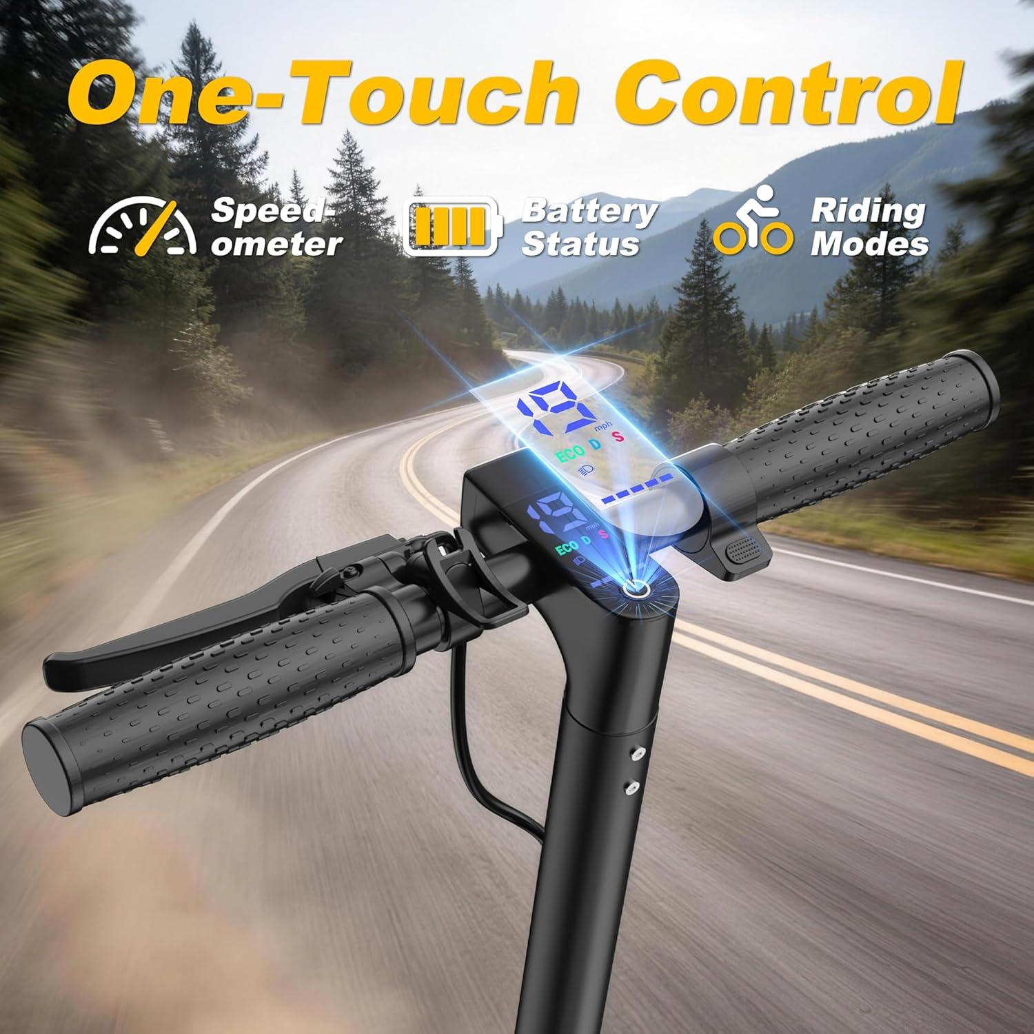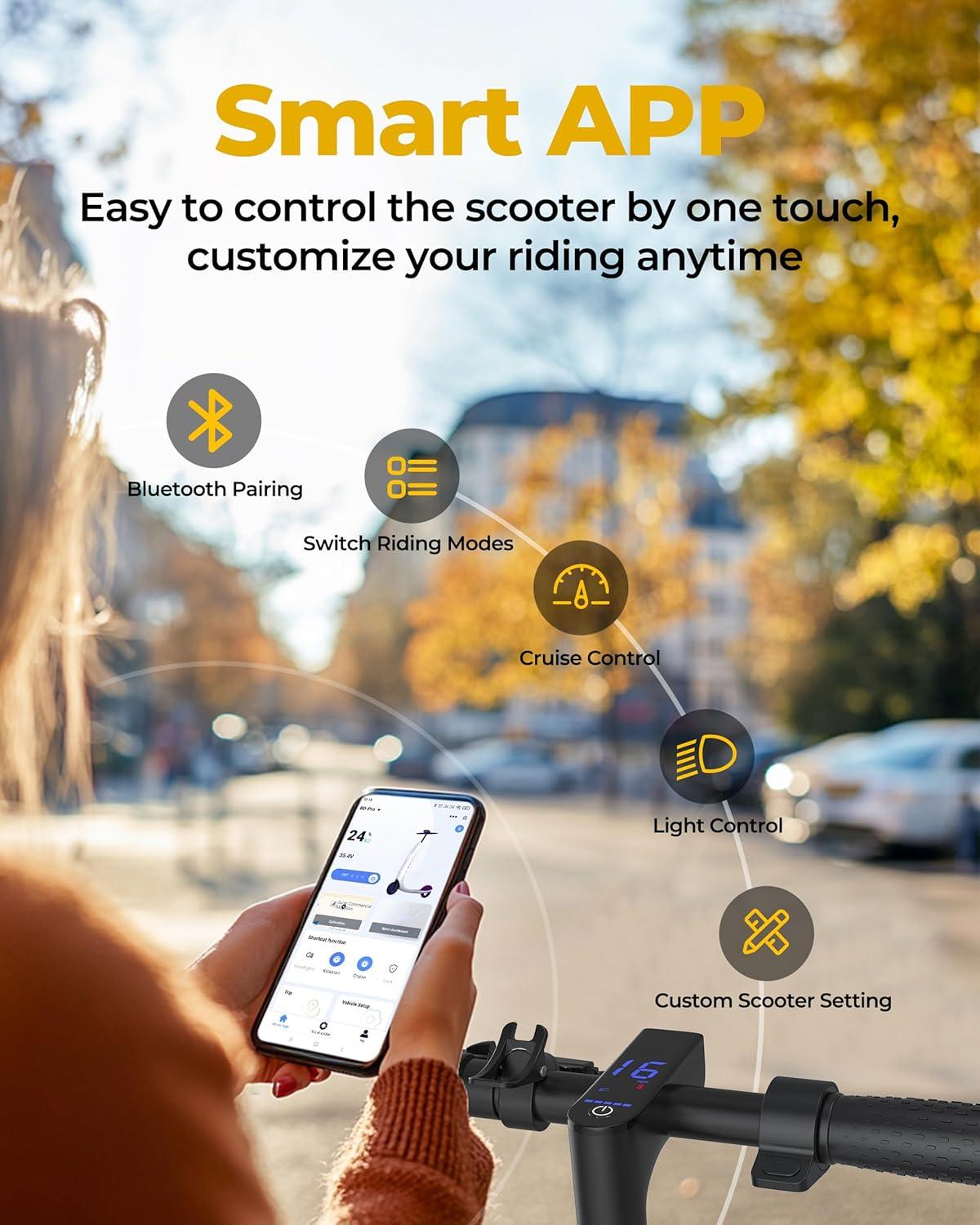 Smart LCD Display & App Control: By using a dedicated mobile app to control your e scooter, you can keep track of real-time speed, riding mode, and battery level at any time. You can also choose different modes, adjust speed, cruise control, light system, and enable secure locking to create a safe and personalized riding journey.